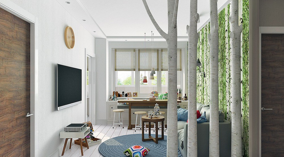 Колоннада из стилизованных берёз — главный элемент интерьера комнаты. «Берёзовая аллея» — это не только арт-объект, но и сквозная перегородка, зонирующая пространство на прихожую и гостиную. Фотопанно с изображением берёзовой рощи дополняет «природную» тему, создаёт ощущение глубины и вызывает положительные эмоции.