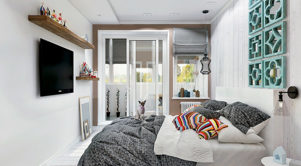 Лаконичный, «холодный» интерьер продолжает тему берёзового леса — о нём напоминает обшивка из белёных деревянных досок на стене в изголовье кровати. Украшение комнаты — панно из состаренных зеркал в рамках с геометрическим орнаментом и яркие разноцветные подушки. Для оформления окон выбраны римские шторы, которые упрощают декор окна и пропускают больше естественного света.