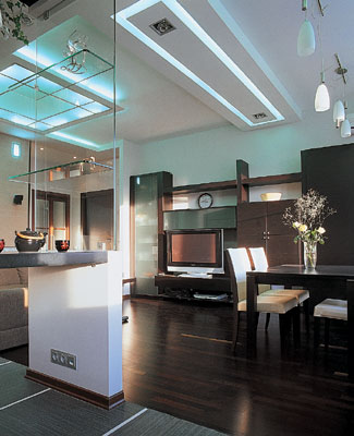 На кухне, как и во всей остальной квартире, расположению потолочных конструкций точно соответствует расстановка мебели и оборудования. На изменение очертаний потолка откликаются даже уровни пола- гостевая часть ниже кухонной зоны (обеденный стол, а также все кухонное оборудование и мебель подняты на невысокий подиум). При этом все предметы кухонной обстановки (от фабрики ASTER, Италия) с духовкой BOSCH (Германия) и микроволновой печью PANASONIC (Япония), как и стальной холодильник LIEBHERR (Германия), продуманно вторят четким формам потолочных конструкций над ними- со стеклянными и окрашенными плоскостями, озаренными "дневным" люминесцентным светом. Японские интонации здесь не читаются как сугубо ориентальные. Сверхзадачей виделась, прежде всего, функциональность и еще раз функциональность. Стол в этой зоне рассчитан только на двоих- он явно «хозяйский». Прозрачное стекло, которым он отделен от гостиной, не лишает возможности видеть все пространство кухни, но тем не менее строго отгораживает одно целевое пространство от другого.
