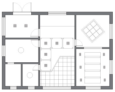 Вгостиной второго этажа также используют фанеру. Придумывая, как сделать эту поверхность интереснее, дизайнер к тому же хотел несколько "принизить" пятиметровый потолок. Так здесь появились два ряда наклонных балок, тонированных под мореный дуб. Они сбегаются к массивной центральной фальшбалке, обшитой ламинированной пробкой. Центральный элемент потолка не только выполняет декоративную функцию, но и частично закрывает конструкцию кровли. Вдетской по обитому досками потолку также положили наклонные балки, пересекающие друг друга с меняющимся шагом. Вхозяйской спальне его покрыли ламинированной паркетной доской. Водном из помещений применили простой, но эффектный прием- при укладке квадратных листов фанеры следили, чтобы рисунок текстуры из тонированных поверхностей смотрел бы в разных направлениях. Когда на потолок падает свет, на нем начинается интересная игра полутонов.