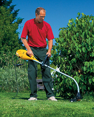 Недостаток у электротриммеров тот же, что и у электрокосилок,- длинный шнур электропитания. Чтобы работать было легче, питающий провод предварительно раскладывают по участку и обматывают им (2-3 витка) несколько деревянных колышков, вбитых в разных местах территории. Стоимость электротриммеров- $100- $300.