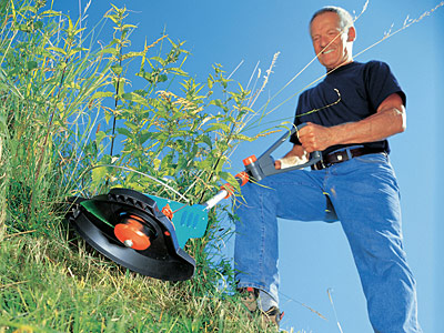 Достоинств у триммеров немало. Они удобны в эксплуатации, легки (1,4-2,6кг), снабжены опорной пяткой, не позволяющей стричь траву слишком низко. Ширина захвата составляет 20-30см, таким образом, за один проход можно скосить полосу шириной 0,8-1,3м. (Со стороны такая "косьба" похожа на работу сапера, водящего перед собой металлоискателем.) Еще одно несомненное достоинство триммера заключается в том, что его режущий элемент, в отличие от газонокосилки, сложно сломать. При столкновении с каким-либо предметом корд изгибается, а затем снова вытягивается в струнку. Если же он все-таки порвется, заменить "усы" не составит труда. Взависимости от модели данная операция осуществляется вручную, полуавтоматически или автоматически. Впервом случае следует заглушить двигатель и вытянуть из бобины леску нужной длины. Во втором- бобина сама сделает это, если слегка ударить ею по земле при включенном двигателе. Вприборах с автоматическим выдвижением лески корд удлиняется на 1-2см при каждом пуске двигателя. Вместо бобины с леской в режущую головку можно установить различные насадки с пластмассовыми или металлическими ножами и (если это предусмотрено конструкцией агрегата) превратить устройство в культиватор, сучкорез, кусторез или снегоуборщик.