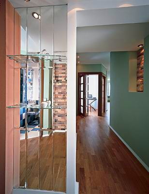 Его раздвижные зеркальные двери зрительно удвоили пространство. Пол покрыли серой керамической плиткой. Сделавшись намного более функциональной, прихожая не стала при этом тесной.