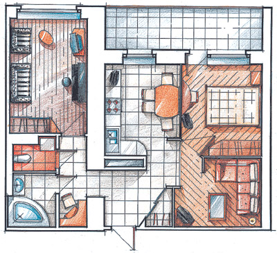 Вместе с тем квартира имела и существенный плюс- просторную удлиненную жилую комнату площадью 20,4м2. За счет части площади именно этой комнаты увеличили кухню, создали маленький шестигранный холл и "выкроили" третью комнату- отдельную гостиную. Так были перераспределены дефицитные квадратные метры и ликвидированы или уж, во всяком случае, сведены к минимуму недостатки старой планировки.