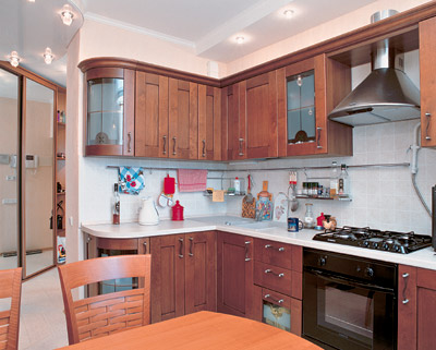 Над восьмиугольным холлом, который сам архитектор назвал стаканом,- такой же восьмиугольный потолок, затянутый французской глянцевой пленкой фирмы NEWMAT. Его высоту уменьшили по сравнению с общим уровнем на 9см. Втолще каркаса натяжной конструкции спрятаны провода, идущие к шести встроенным светильникам, которые расположены по периметру помещения. Маленькие плафончики в золотистых кольцах очень украшают блестящую плоскость потолка, ярко отражаясь в ней. Кроме того, декоративные светильники отражаются в зеркалах шкафа соседней прихожей. Эти огромные зеркала не просто зрительно раздвигают стены узкого помещения, но и умножают на два число осветительных приборов. Уже из прихожей мы видим в зеркале интерьер кухни, а наш путь освещает отражение лампы под абажуром над обеденным столом. Такой декоративный прием подчеркивает необычность всего композиционного решения этой части квартиры.