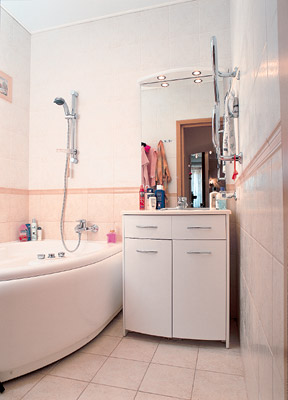 В ванной и туалете- итальянская керамическая плитка фирмы MARAZZI на стенах и натяжные потолки французской фирмы NEWMAT над головой. Разумеется, полностью заменили старую сантехнику- на угловую пластиковую ванну и «мойдодыр» (комплект, состоящий из туалетного шкафчика, встроенного в него умывальника и большого зеркала с козырьком для подсветки). Справа от умывальника на стене смонтировали электрический полотенцесушитель, который, в отличие от своего водяного предшественника, будет работать даже при отключенной горячей воде. Все инженерные коммуникации, в том числе трубы водоснабжения, требовали полной замены ввиду своей ветхости. Трубы отопления тоже поменяли, а чугунные радиаторы оставили, поскольку сочли еще вполне дееспособными. Имеющаяся в туалете ниша была переоборудована под стиральную машину, которая до того находилась в ванной комнате. Благодаря этому помещение ванной стало более просторным.