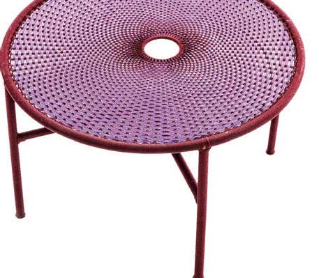 из лакированной стали, а столешница выполнена из переплетенных ярких полиэтиленовых нитей.