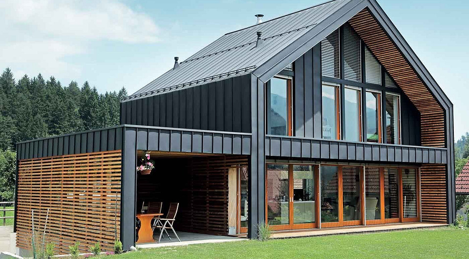Фальцевые конструкции стали использовать и в отделке фасадов: они идеально смотрятся в стилистике Вarnhouse (дома простых форм, которые раньше были характерны для хозяйственных построек).