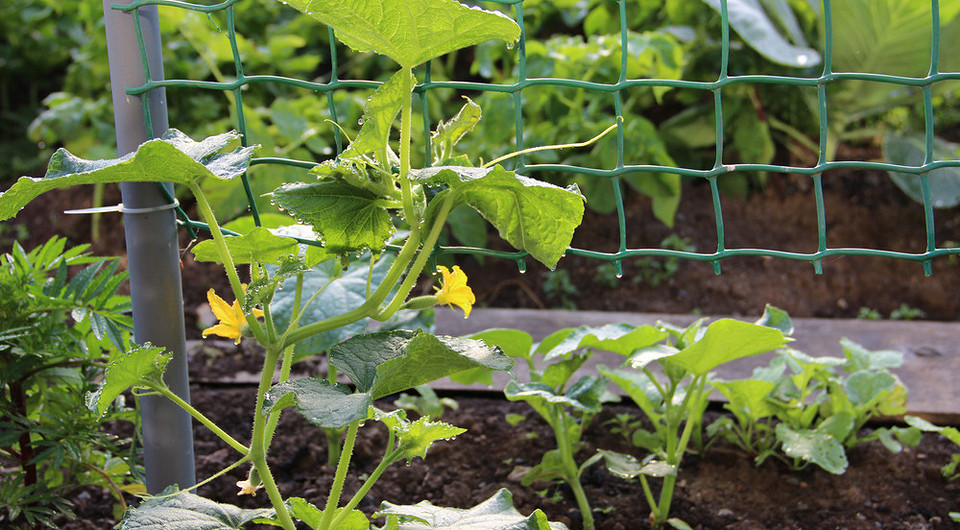 Универсальный и очень простой способ. Он заключается в том, что в качестве шпалеры используют садовую сетку. Ее натягивают на вертикальные опоры, направляют на нее огуречные плети, мягко фиксируют через каждые 25-35 см.