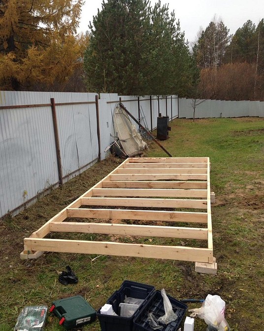 Начинают с установки обвязки. Это короб из бруса, который укладывается на опоры. Для его сборки бруски запиливают вполдерева, складывают и для прочности фиксируют шпильками. Затем укладываются лаги. Шаг укладки — 50 см. После это начинают монтировать стойки из бруса. В рекомендациях, как построить бытовку своими руками, можно найти два варианта изготовления несущей конструкции.