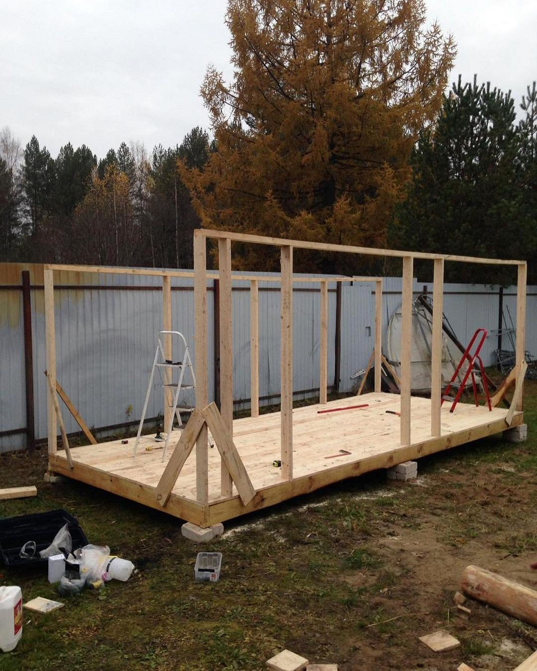 В первом ее сваривают из металлических квадратных труб. Получается прочная и долговечная система, но цена ее будет значительно выше. Можно поступить иначе и сложить каркас из бруса. Все стойки выставляют строго вертикально относительно обвязки, временно фиксируя подпорками. Проверяют вертикаль, после чего закрепляют окончательно, усиливая металлическими уголками. Ставят деревянные укосины, они укрепят конструкцию.