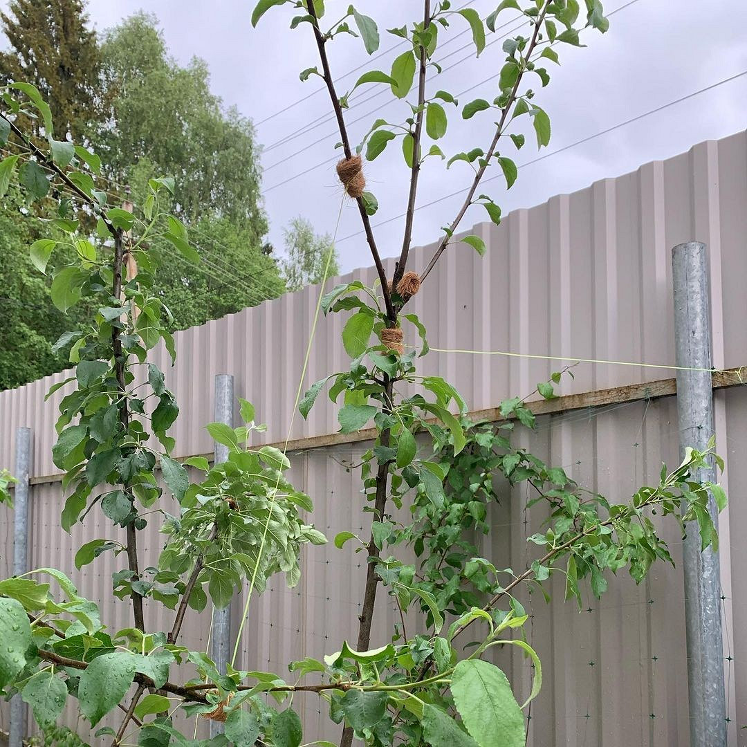На веточку накладывают кусочек резины, чтобы не повредить кору, на него привязывают конец веревки или проволоки. Другой конец закрепляют к вбитому в землю колышку так, чтоб ветвь отклонилась от ствола под нужным углом. Через четыре-пять месяцев побег примет нужное положение. Если это произошло, его освобождают от проволоки. В противном случае оставляют в подвязанном состоянии еще на некоторое время.