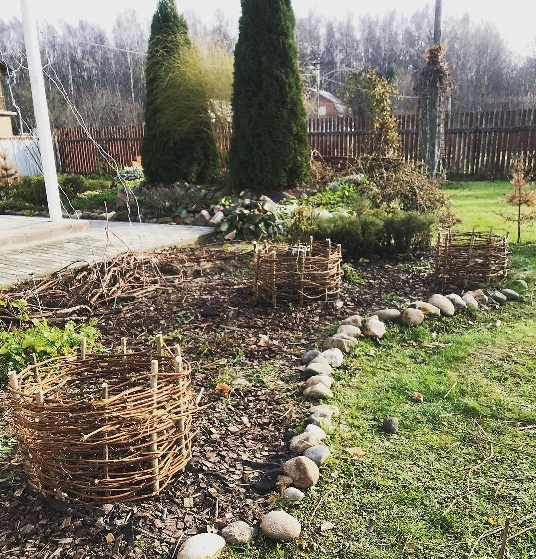Плетеные ограды очень эффектны. Для их изготовления лучше всего подходят ивовые прутья, но можно попробовать сплести плетень и из других пород.