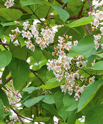 Обратите внимание на катальпу, с крупными листьями и метелками больших белых цветов, распускающихся в июне. Многие виды этого растения прекрасно чувствуют себя на юге России, а вот катальпа прекрасная может стать украшением сада даже в средней полосе.