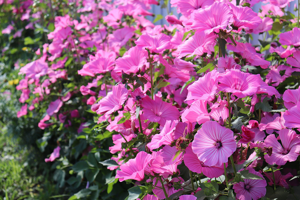 Лаватера начинает цвести через 2 месяца после появления первых ростков, и затем крупные шелковистые бутоны обильно покрывают растение вплоть до конца сентября. Цветок предпочитает рыхлую почву и не выносит застоя воды у корней, поэтому важно поливать его умеренно. Лаватера крайне устойчива к дождю и ветру, благодаря чему ее не нужно подвязывать.