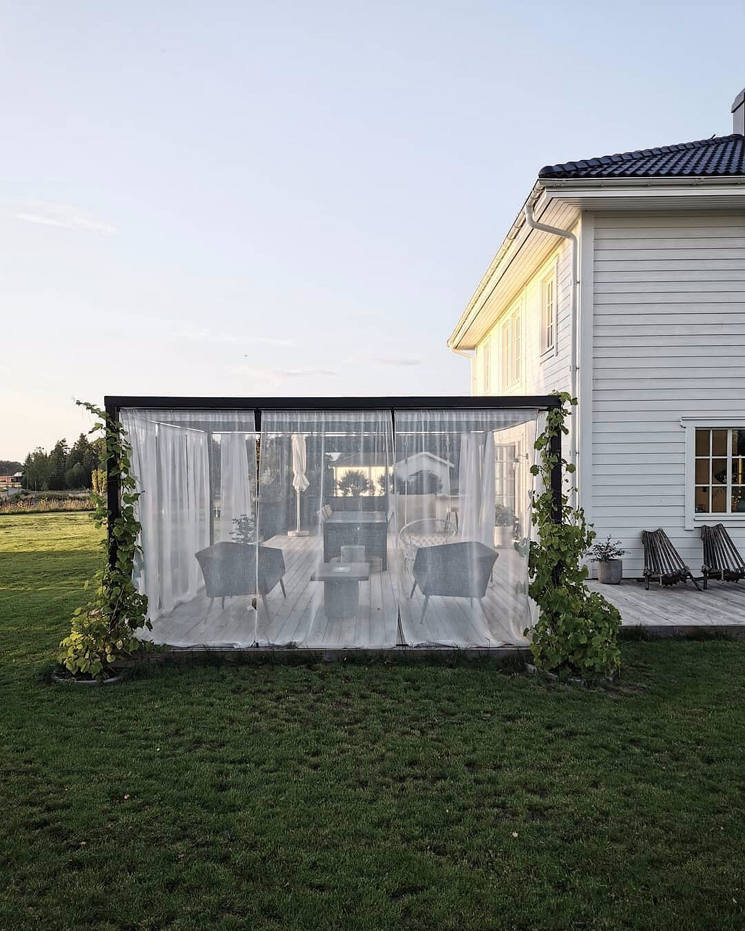 Хотите оградиться от посторонних глаз? Под крышей закрепите продольные балки — это будет карниз для плотных штор или более легких занавесей. Это не только функциональное, но и очень симпатичное решение.