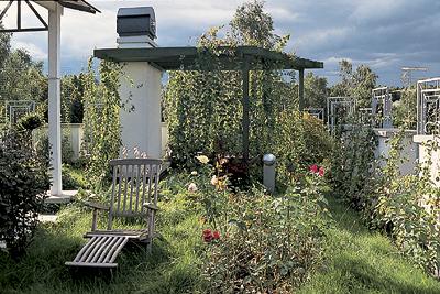 Трудоемкий процесс организации "зеленой" кровли в полной мере компенсируется связанными с нею преимуществами. Так, достаточно толстый слой земли (40-60 см) предохраняет находящиеся под ним материалы от резких перепадов температур (сильного охлаждения зимой и чрезмерного перегрева летом), от воздействия дождя, ветра и снега. За счет этого крыша меньше изнашивается и служит гораздо дольше, чем открытая. Еще один плюс такого решения- более комфортная температура внутри помещений: всреднем она на 3-4С выше зимой и нижелетом. Иконечно, сад на крыше- это тихий уютный уголок, где всегда приятно отдохнуть от суеты душного города.