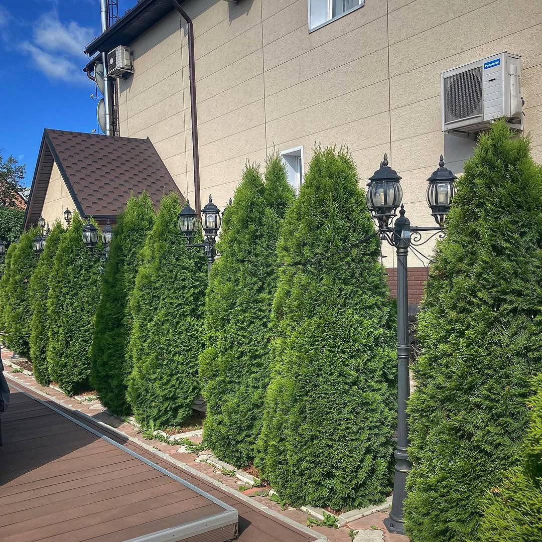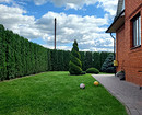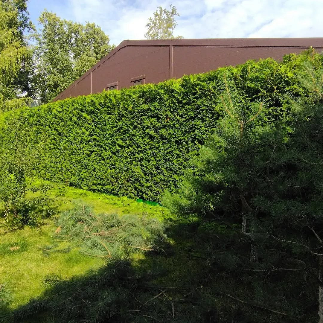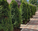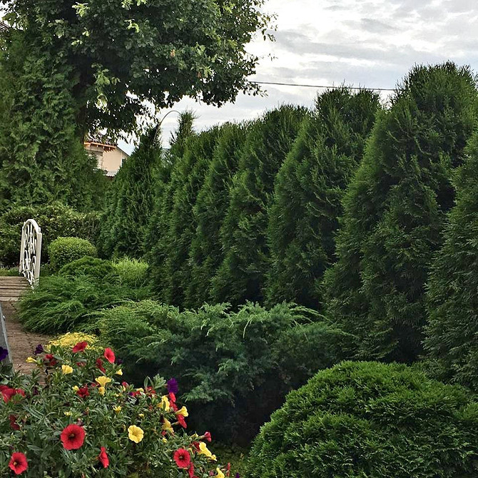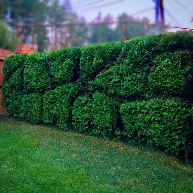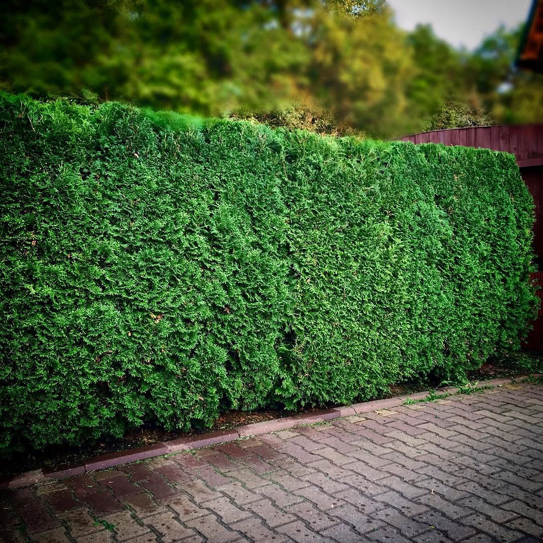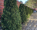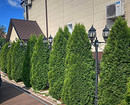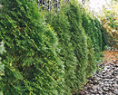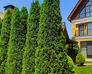 - Если посадить туи в качестве изгороди, они будут хорошо защищать от шума со стороны соседей или дороги, а также от сильных порывов ветра.