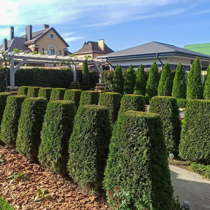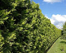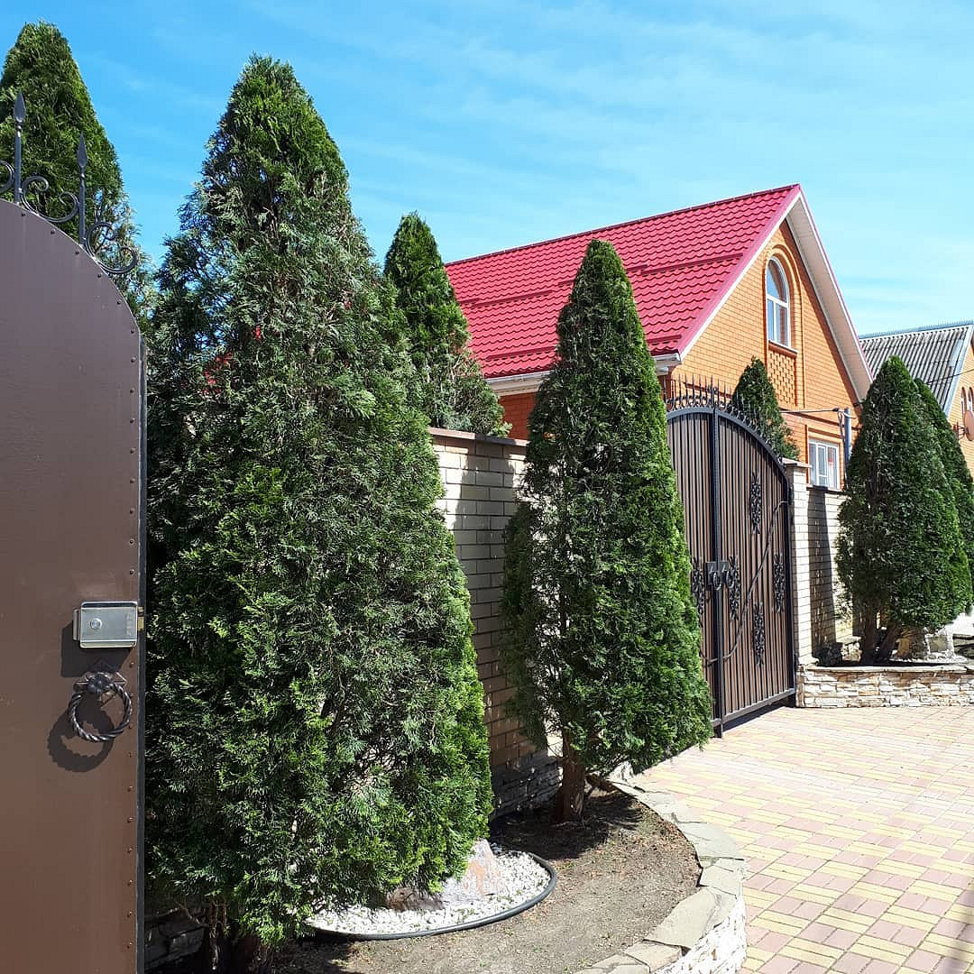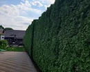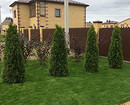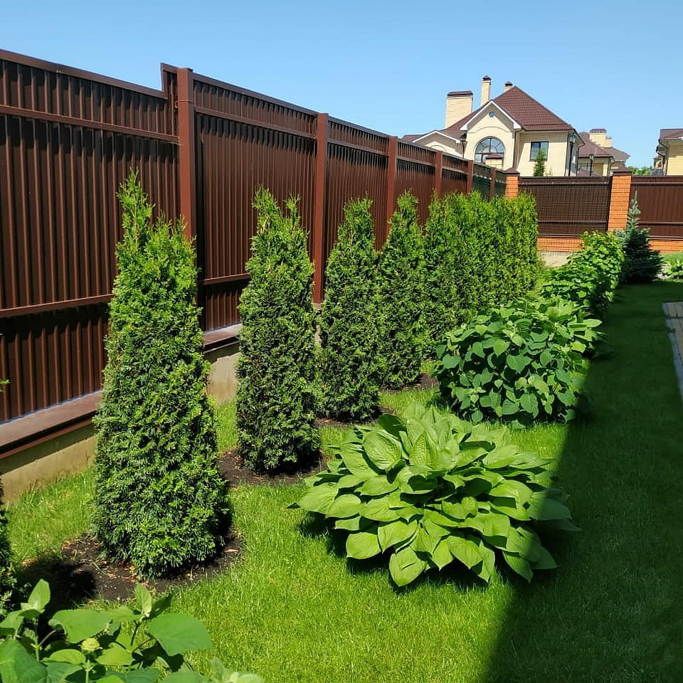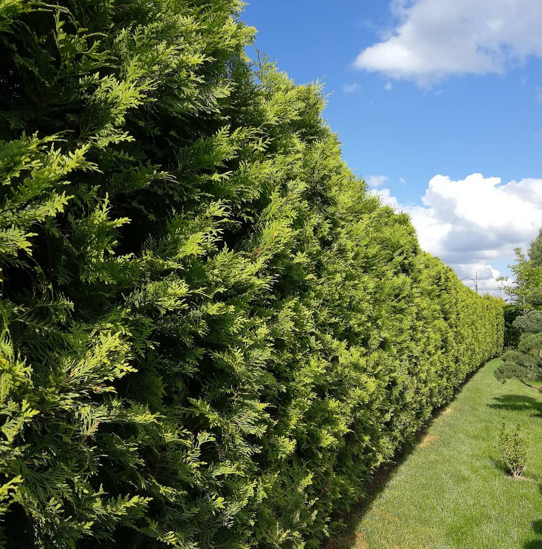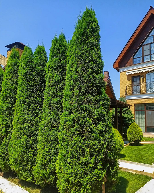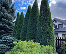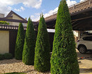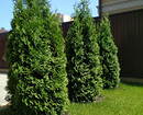 - Если посадить туи в качестве изгороди, они будут хорошо защищать от шума со стороны соседей или дороги, а также от сильных порывов ветра.