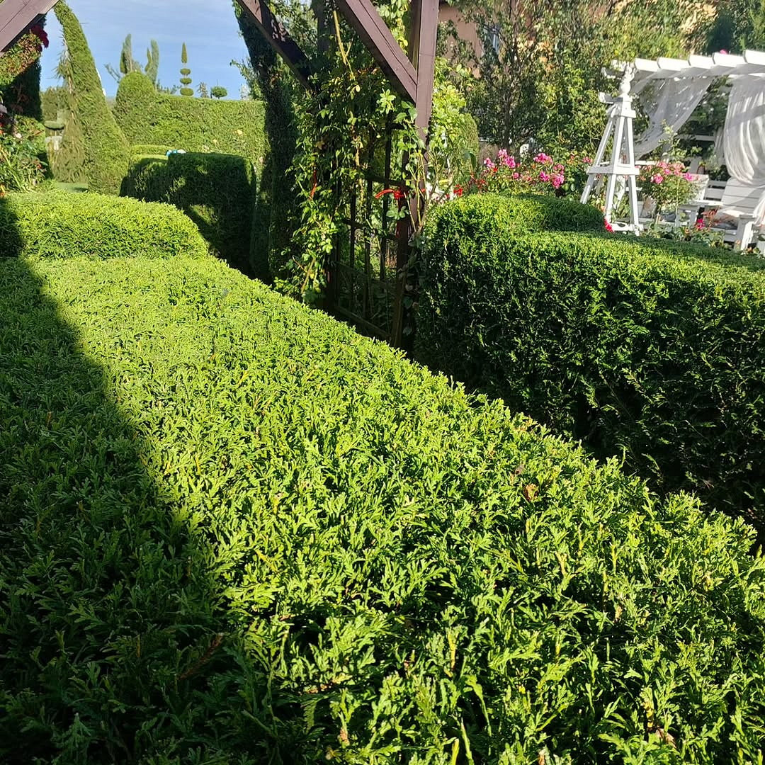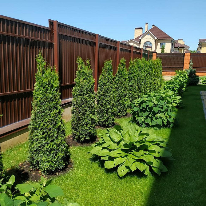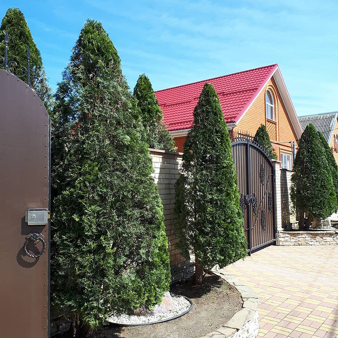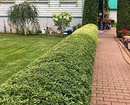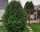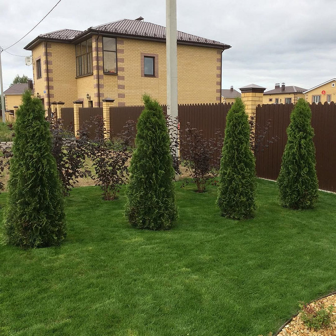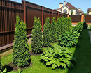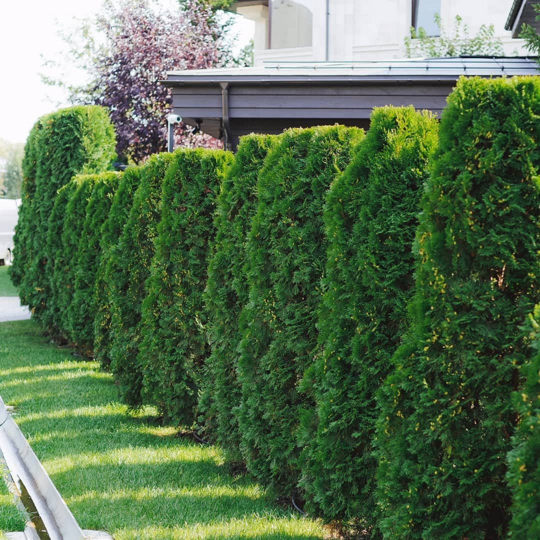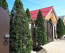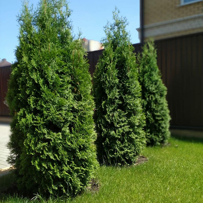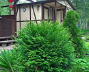 - Если посадить туи в качестве изгороди, они будут хорошо защищать от шума со стороны соседей или дороги, а также от сильных порывов ветра.