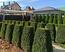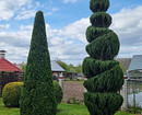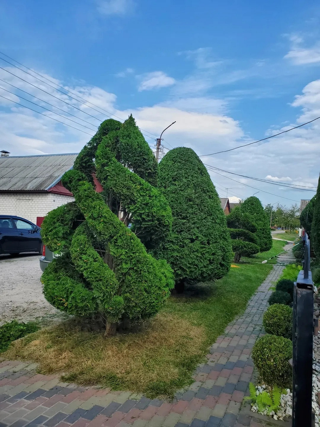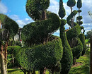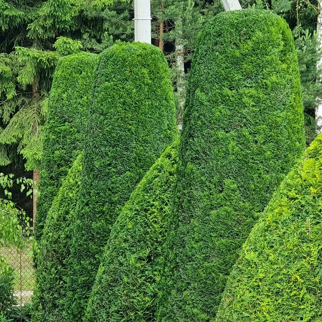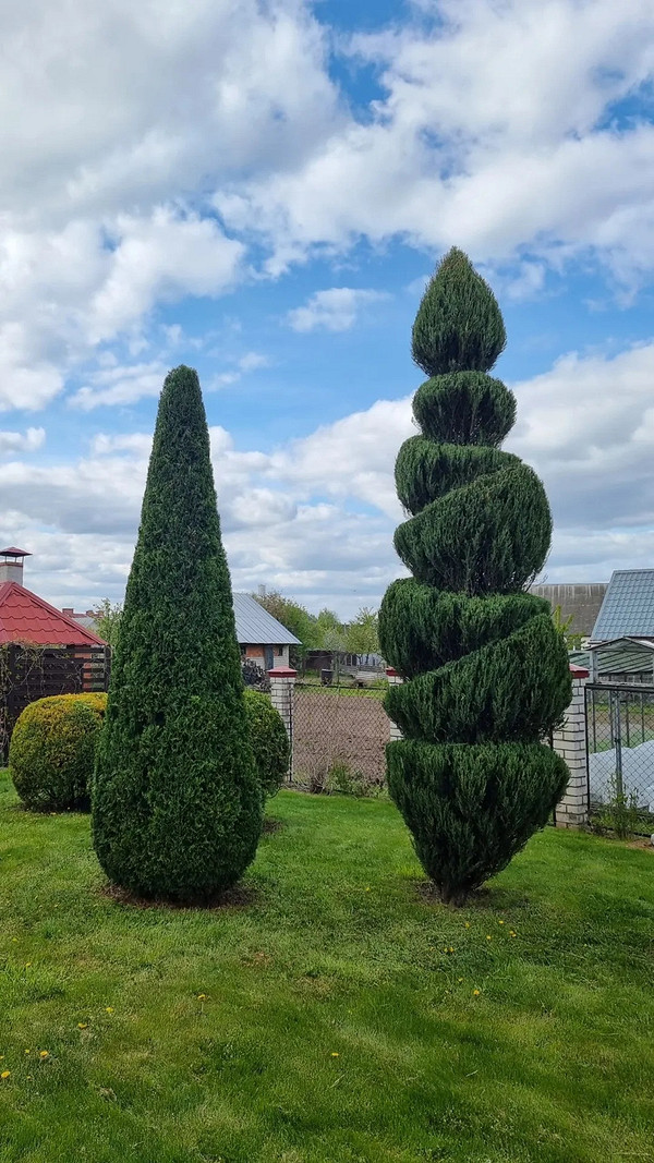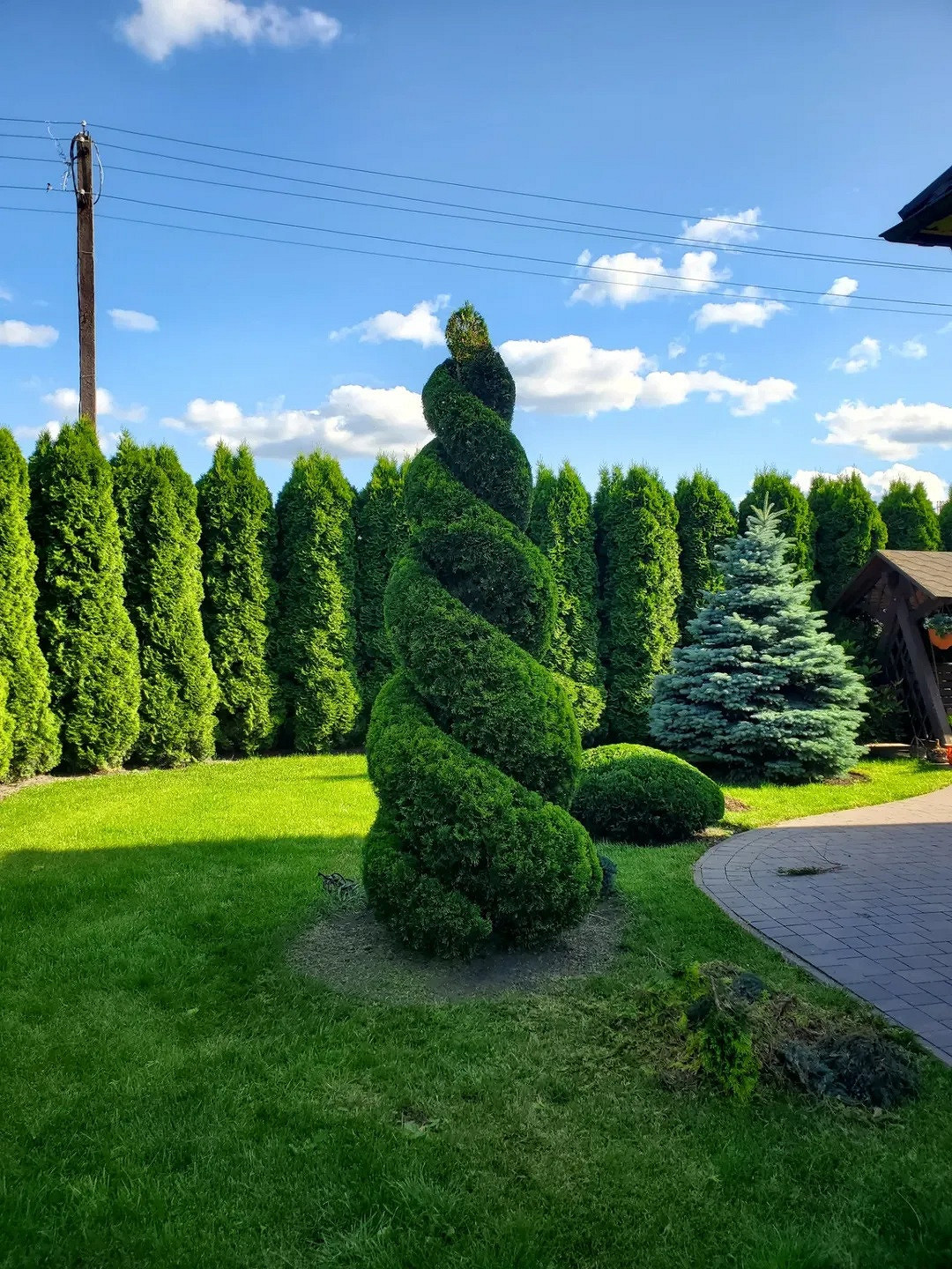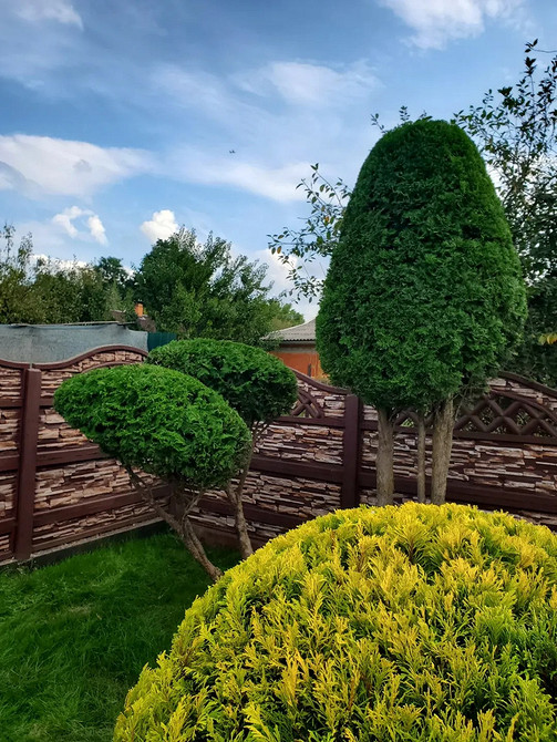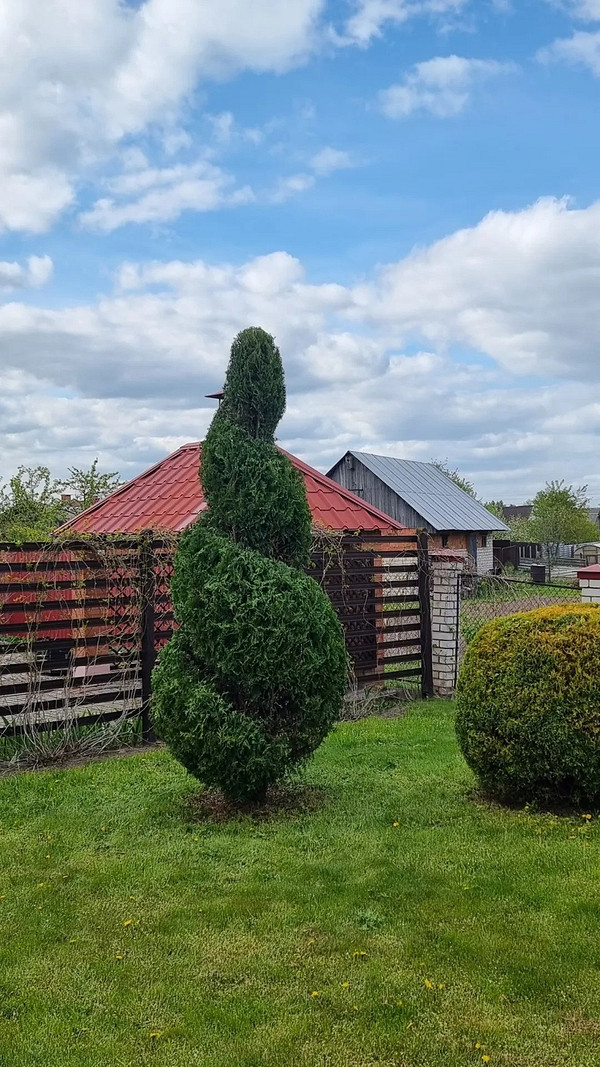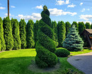 Для такой стрижки выбирают виды средней высоты с густой и плотной кроной, например, Смарагд. Обычно делают несколько однотипных деревьев, однако можно проявить фантазию и создать целый вернисаж из различных фигур.