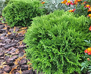 Подбирая компанию этой культуре, надо думать не только о красоте будущего пейзажа, но и о том, насколько будет комфортно растениям рядом. Например, не стоит сажать тую близко к плодовым деревьям: у них совершенно разные требования к почве и к тому же могут быть общие вредители. Не подойдут ей в качестве соседей и ягодные кустарники, у которых она будет отбирать питательные вещества. Кроме того, у шаровидных сортов обычно неглубокая корневая система, поэтому рядом с ними не рекомендуется располагать многолетники, которые надо выкапывать на зиму.
