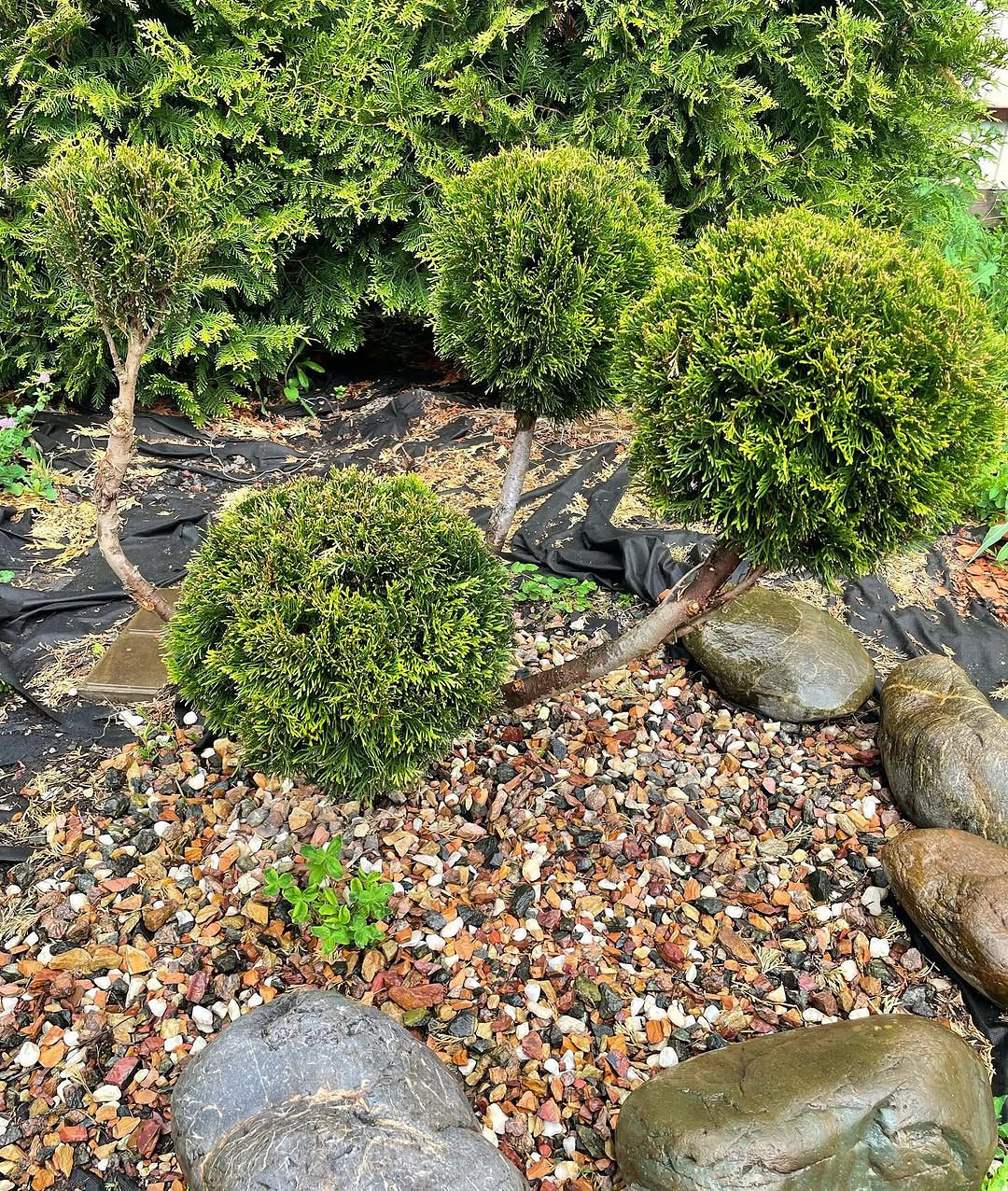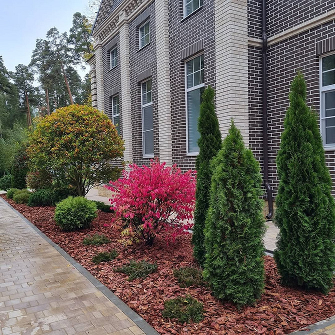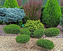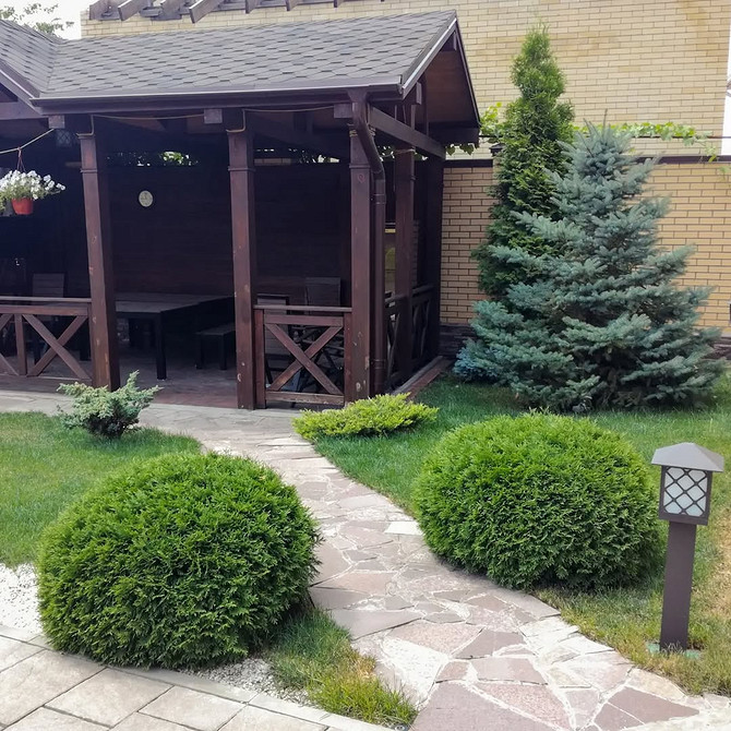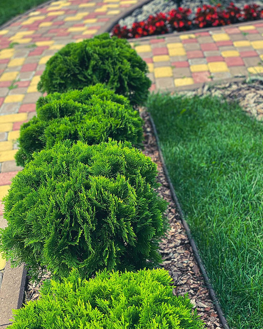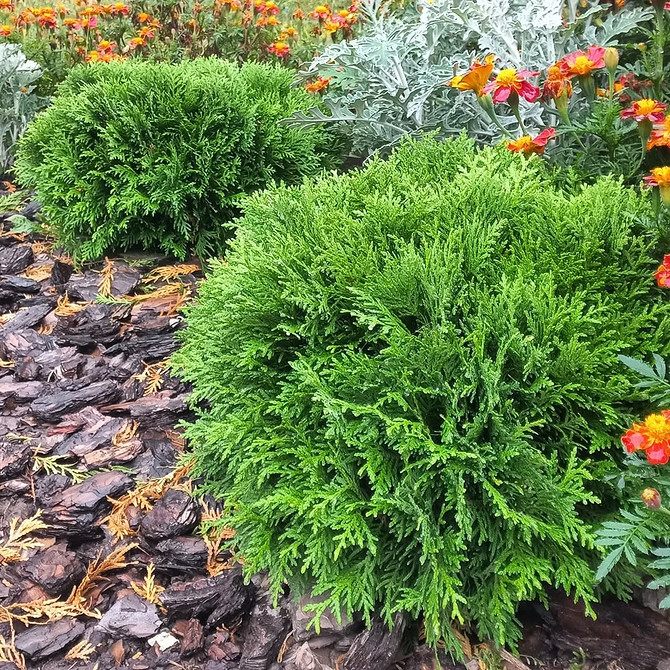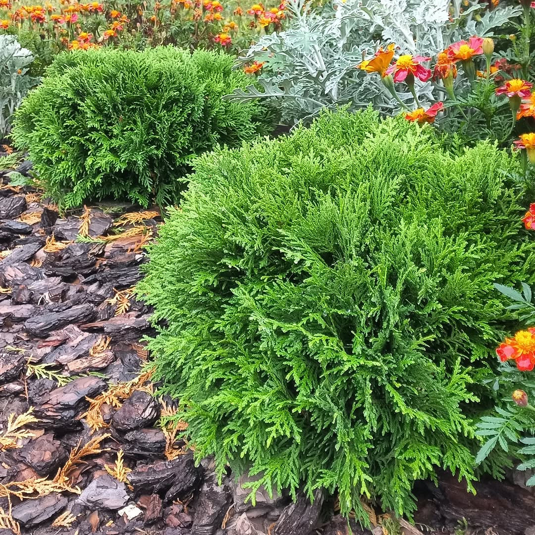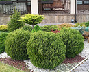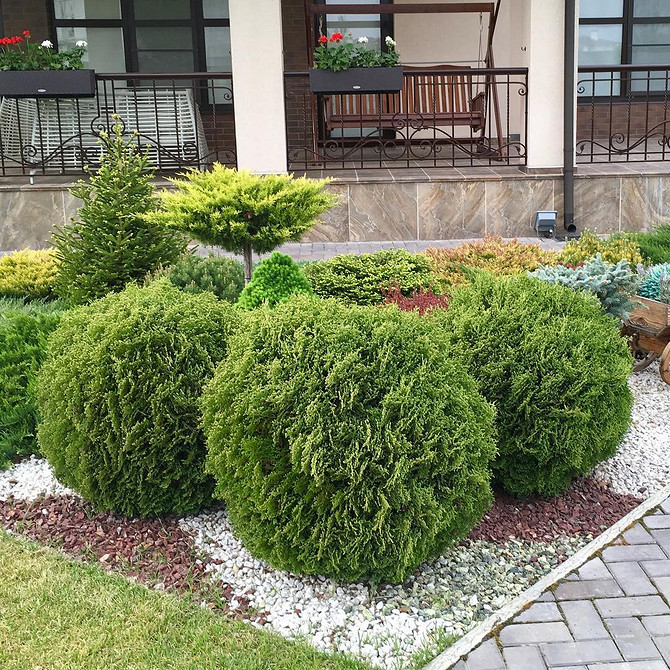 Даника, Вудворти и другие виды, принимающие форму шара, можно располагать и ближе к переднему краю цветника. Кроме того, нередко туи сажают в линию, чередуя с высокими пышными кустами. В альпинариях и рокариях не высаживают высокорослые сорта культуры — вместо них выбирают карликовые и шаровидные разновидности.