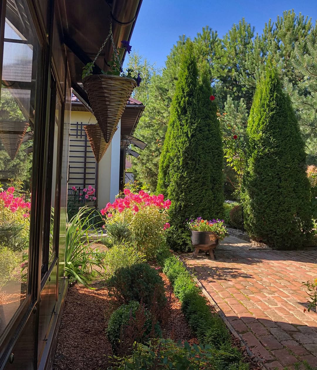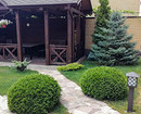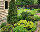 - Цветы — пышный зеленый шар Даники в окружении ковра из почвопокровников или пирамида Смарагда, перед которой растут цветы с крупными бутонами (лилии, флоксы, астильбы), станут отличным украшением участка.