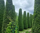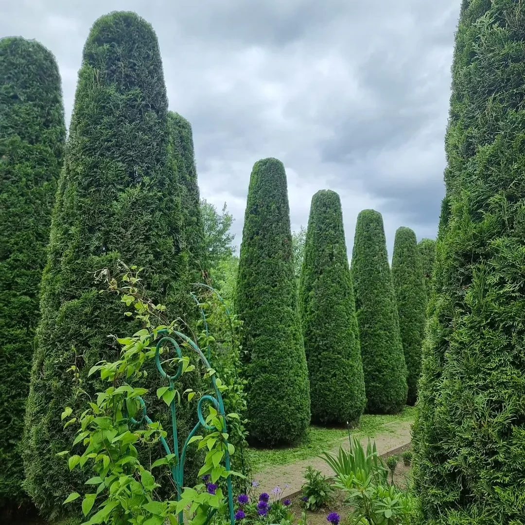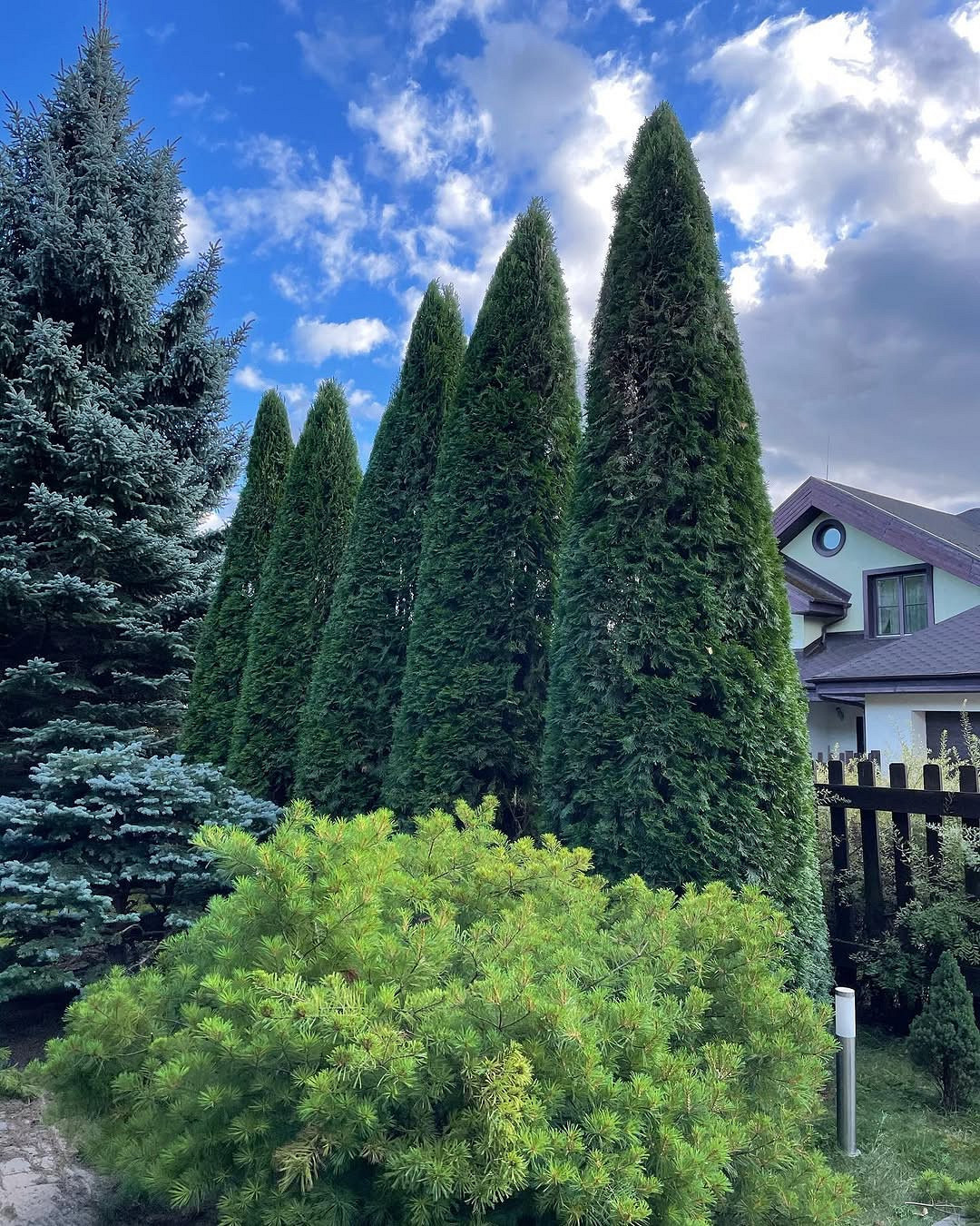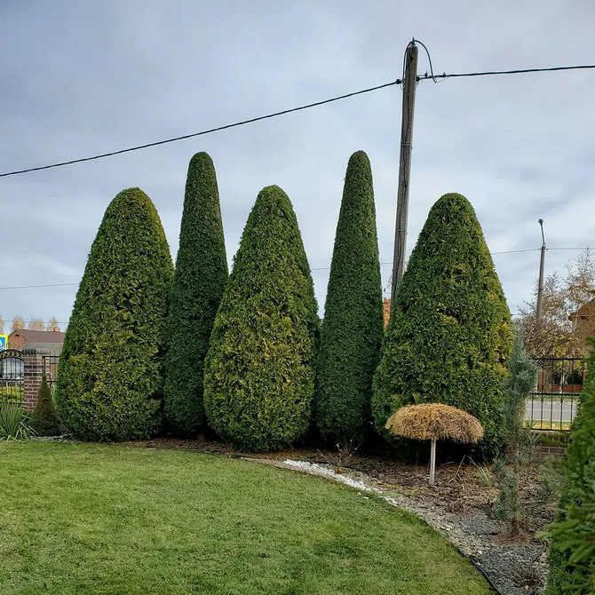 - Тую Смарагд можно увидеть чаще всего. У нее много достоинств — в частности, ее ценят за компактные размеры: несмотря на то что она может достигать 4 метров и больше, из-за крайне медленного роста первые 20-25 лет она не будет превышать 2-2,5 метра в высоту, а в диаметре 2 метров. Кроме того, ее хвоя остается зеленой даже в сильные морозы, поэтому она идеально подходит для умеренных и северных широт. Но все же главное ее преимущество в том, что, вырастая, она сохраняет идеальную пирамидальную форму и не нуждается в формирующей обрезке.