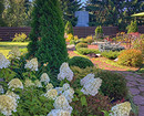 - Кусты — чтобы такая комбинация смотрелась эффектно, желательно выбирать цветущие кустарники или искать виды с необычными листьями: подойдут барбарис, спирея, гортензия.