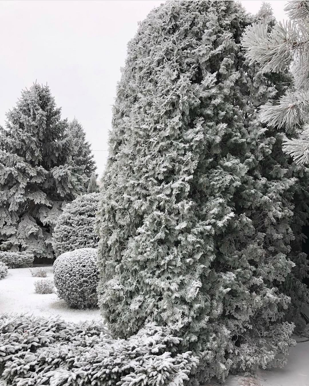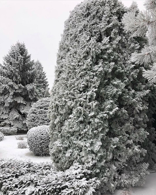 - Красивый вид круглый год — на зиму растение не сбрасывает хвою и остается зеленым. Некоторые сорта могут зимой менять цвет кроны (на буро-желтый или коричневый), но к лету изумрудный оттенок возвращается.