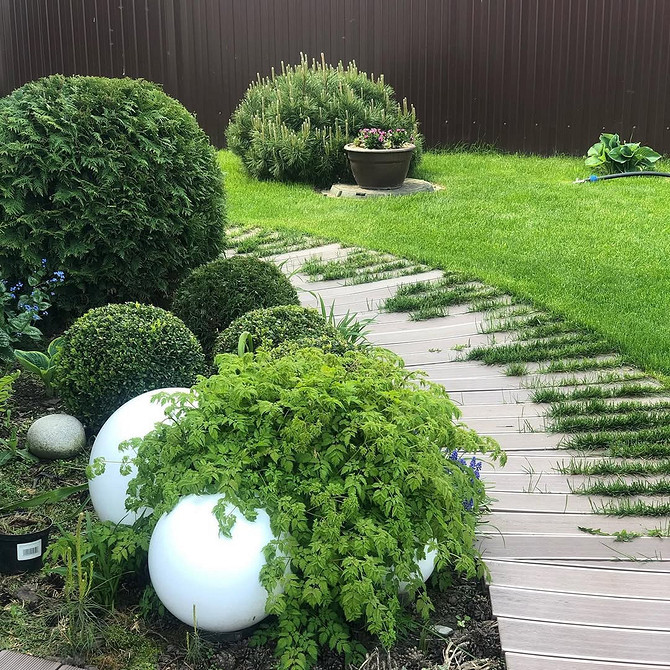 Четкий ряд стройных деревьев или пышных зеленых шаров придает ландшафту визуальную законченность и ритмичность. Таким образом можно обозначить край участка, оформить садовые дорожки или использовать для зонирования территории.