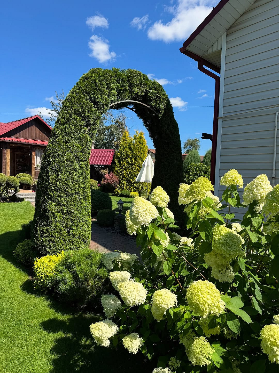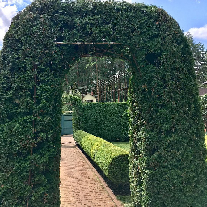Другой вариант — создать зеленую арку. Для этого вкапывают две трубы на ширину прохода, в которые вставляют дугу из металлической арматуры (пластиковая может не выдержать веса подросших деревьев). Саженцы по мере роста аккуратно приматывают к ней толстой эластичной веревкой или проволокой, следя, чтобы она не впивалась в ствол. Постепенно деревья вырастут до самого верха и сомкнутся, образовав красивый полукруглый проход.