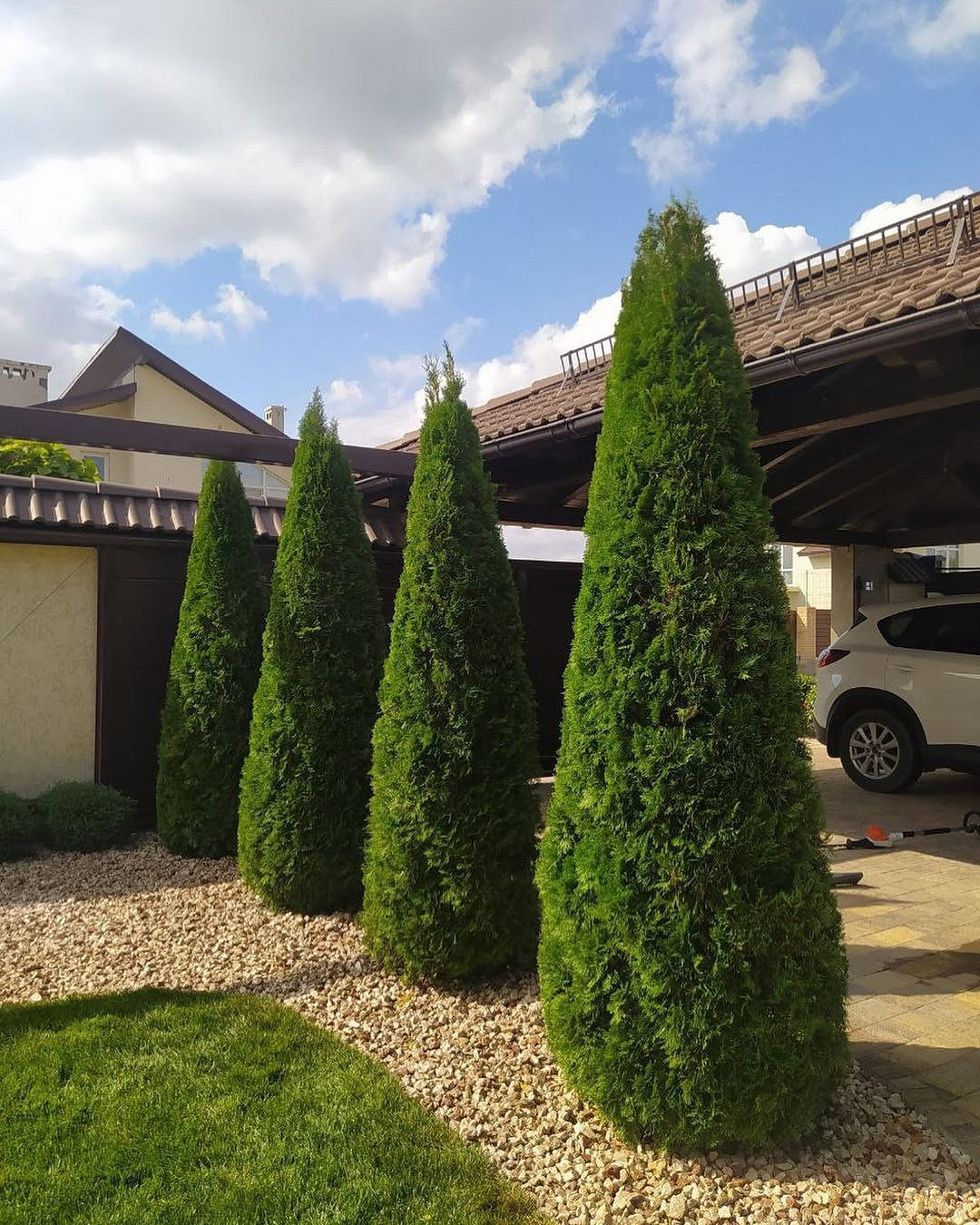Парные и групповые посадки — хорошая идея, как красиво посадить туи на участке, чтобы заполнить пустые места и не создать при этом визуального шума.