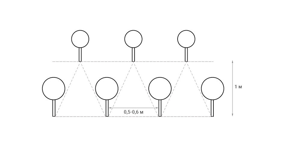 Для плотной, непроницаемой изгороди между саженцами оставляют расстояние 0,5-0,6 м. Для декоративной ажурной композиции в дополнение к забору можно увеличить промежуток между посадками до метра и даже больше, если вы выбрали раскидистый сорт (Брабант, Джордж Пибоди,Нигра, Зебрина). Слишком загущать посадки не стоит, так как деревья начнут мешать друг другу, в переплетениях веток будет скапливаться влага, что может привести к появлению грибковых заболеваний. До следующего ряда, если он есть, должна быть дистанция в метр (схема посадки показана ниже).