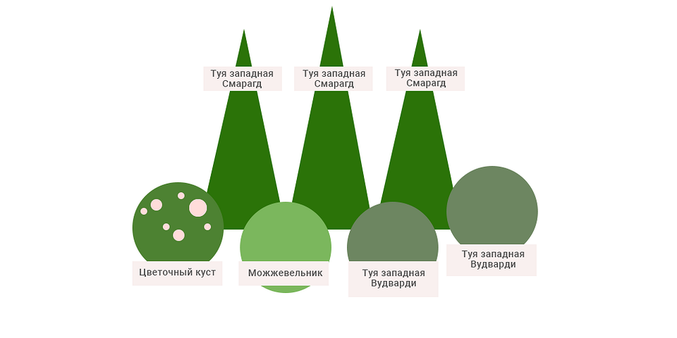 Для декорирования границ дачного участка или оформления забора можно чередовать разные виды туй или компоновать их с другими культурами. Хорошо смотрятся высаженные поочередно высокорослые и низкорослые сорта (в один ряд), перед которыми расположены карликовые экземпляры (вторым рядом в шахматном порядке). Также можно создать целую композицию из представителей этого семейства и его близких родственников — кипариса, можжевельника, пихты и т.д. Принцип дизайна будет тот же — фон из самых высоких насаждений, потом среднерослые и впереди самые низкие. Есть и более простой вариант, когда кустарниковые виды располагают на фоне полноценных деревьев, как на рисунке ниже.