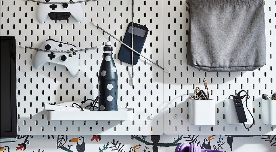 Часто настенные панели используют для организации пространства домашнего офиса или детской. Но возможности такого варианта хранения безграничны, и один из удобных способов организовать проводку и разместить прочие элементы домашней техники — именно настенная панель. Дополните ее крючками, зажимами или органайзерами. Повесить такое панно можно неподалеку от компьютера или рядом с розетками. Теперь ваши зарядные устройства и usb-гаджеты всегда будут на виду.