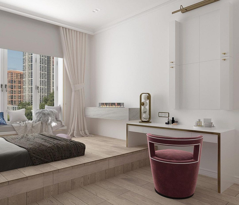 В этом дизайн-проекте спальни вы не увидите экрана — его там действительно нет. Планируется, что проектор будет светить на участок стены над камином — по этой причине его не заполняли декором.