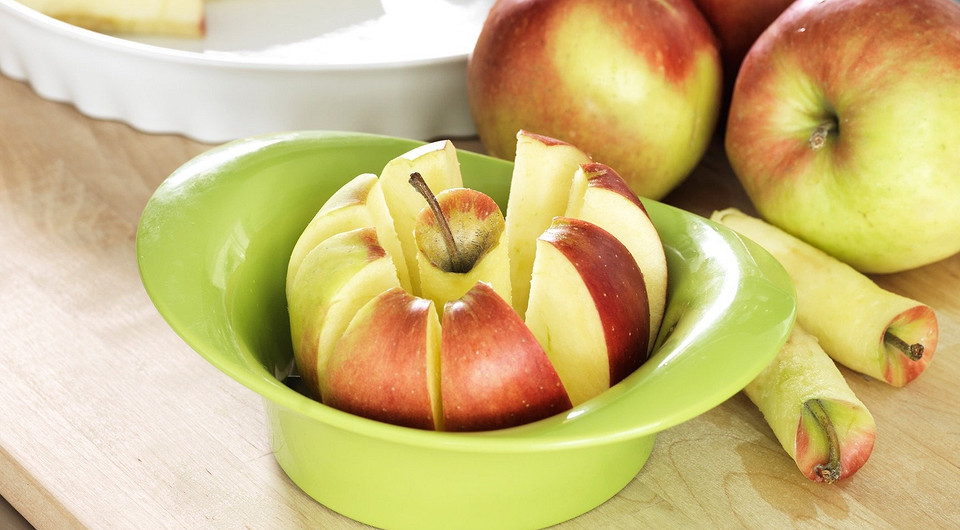 Нарезать яблоко на дольки — занятие долгое. Упростить его поможет ломтерезка. Ее нужно разместить на вершине фрукта и с силой надавить. В итоге получатся ровные дольки и отдельно вырезанная сердцевина. Один недостаток — кусочки получаются довольно крупными, поэтому для украшения пирога вряд ли подойдут. Зато с помощью гаджета очень быстро нарезать перекус для себя или ребенка.