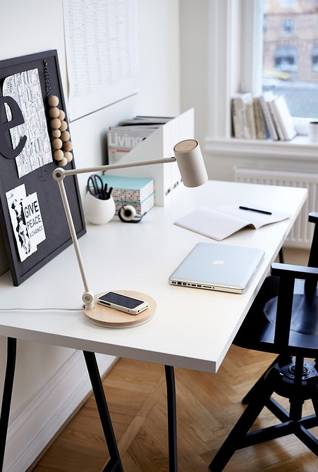 Обеспечить себе комфортную подсветку во время рабочего процесса можно, например, с помощью такой лампы. Благодаря направленному свету удобно клеить или шить в темное время суток: луч не будет рассеиваться по комнате, и подсветка получится более точечной и яркой. В лампу встроена беспроводная зарядка, что очень удобно: ее можно использовать и в обычные время, не только во время работы.