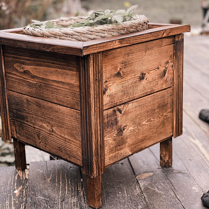 Из дерева можно сколотить стильный квадратный или прямоугольный ящик в стиле хюгге. Либо — если взять старые доски или придать им такой вид искусственно — в духе кантри. Конструкция из вагонки, брусьев, бревен или досок получается простой, можно справиться даже с минимальным плотническим опытом (или вовсе без него). Только учтите, что само по себе дерево не любит контакт с влагой, поэтому его нужно пропитать защитными составами, а еще лучше — проложить изнутри водонепроницаемой пленкой или закрепить садовый мешок.