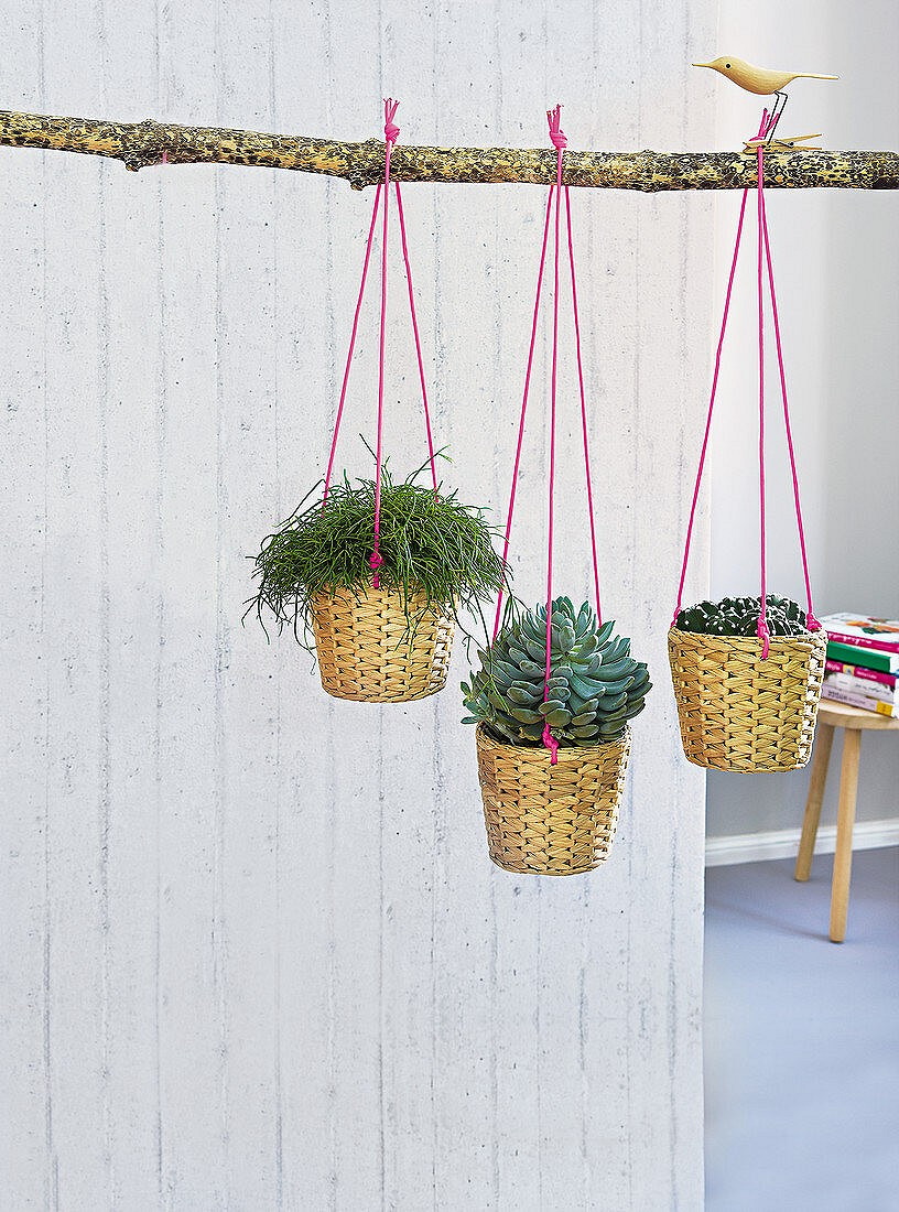 А если вы хотите украсить комнату или веранду подвесными горшками, для них можно сделать кашпо-подвес из толстых нитей