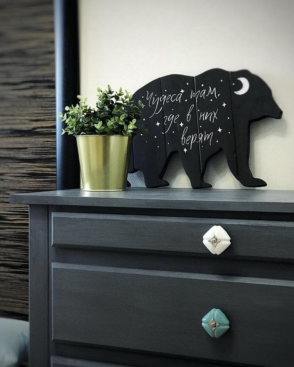 Такое милое панно с нежной надписью придется кстати в любой детской комнате. Можно сделать его из фанеры или сколотить из досок, а затем окрасить грифельной краской. А можно пойти еще более простым путем: вырезать основу из плотного картона (склейте несколько слоев, если нужна более прочная конструкция) и оклеить самоклеящейся бумагой с имитацией грифельной поверхности. Готово: берите мел или меловой маркер — и наносите нужные надписи и рисунки.