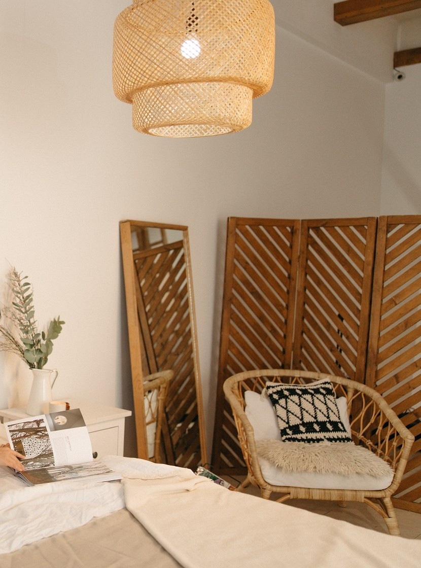 Также по бокам от него можно разместить настенные или подвесные светильники. Рядом поставить букет сухоцветов или несколько веточек в простой вазе или стакане.
