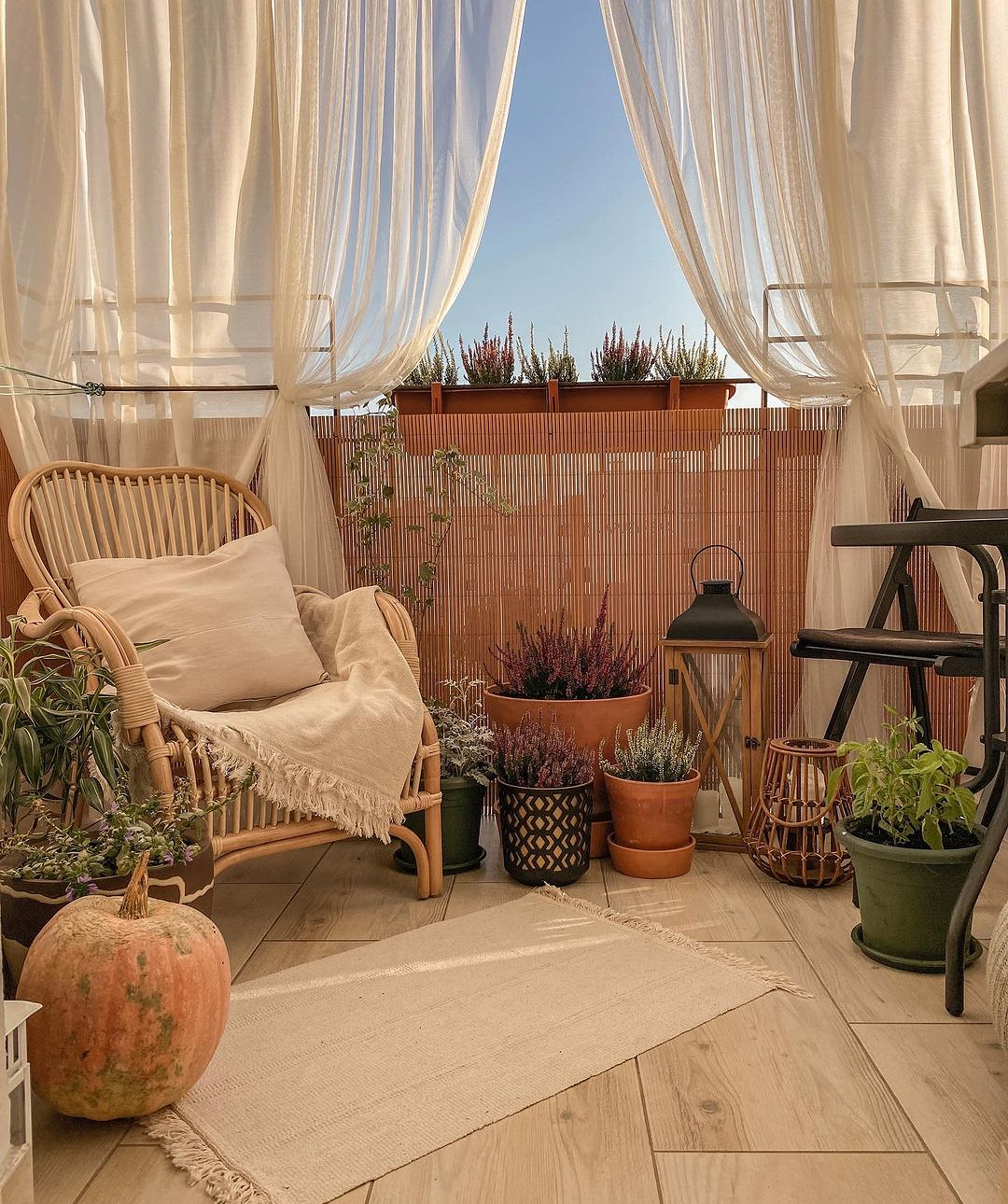 Осенью по-особенному атмосферно смотрится на балконе плетеная мебель. Если лоджия маленькая, можно ограничиться одним креслом. Дополните его светлыми пледом, подушкой и небольшим ковром, чтобы получить завершенную композицию. На окна стоит повесить легкие шторы молочного оттенка — они добавят чувство уединения по вечерам, но не перекроют свет, которого осенью и так немного. Несколько растений в горшках и тыквы будут кстати.