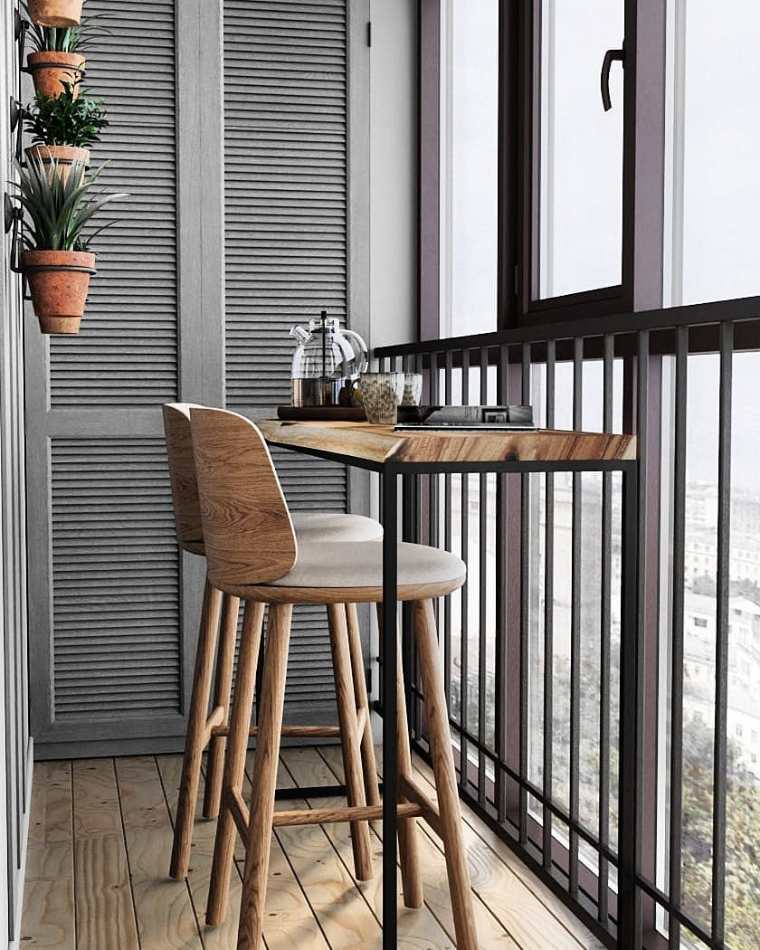 - Не стоит увлекаться созданием дополнительных мест хранения, например, обустройством ящиков под покрытием стола. Бар на балконе не должен быть перегружен, он несет функцию дополнения пространства, не более того. И здесь правильно железное: чем проще дизайн, тем лучше.