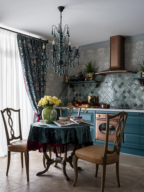 Глубокие оттенки синего, напоминающие цвет неба перед наступлением ночи, прекрасно сочетаются с осенней палитрой в целом. Они придают интерьеру загадочности и глубины, а также отлично работают в комбинации с золотыми, терракотовыми, желтыми акцентами. И самое главное — этот холодный цвет полностью рушит стереотип о том, что осенний интерьер должен быть оформлен только в желто-оранжево-бежевой гамме.