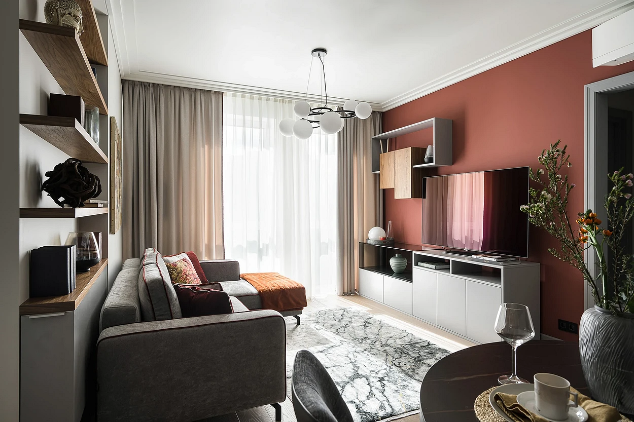 Еще один яркий оттенок, который прекрасно подходит для сезонного преображения квартиры. Темно-красная палитра напоминает об опавших листьях, а в сочетании с приглушенными природными оттенками выглядит достаточно сдержанно. Красный подходит как для текстиля или некрупного декора, так и для оформления акцентной стены, если вы готовы к экспериментам.