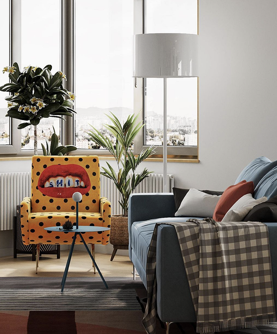 Для начала определите участок комнаты, который дольше всего освещается солнцем на протяжении дня. Это идеальное место для чего-то яркого: например, большого желтого кресла или акцентной зеленой стены. Затем добавьте в эту зону несколько искуcственных источников света: поставьте торшер на пол или светильник на полку. Так яркая зона будет достаточно освещена и в пасмурные дни или вечером.
