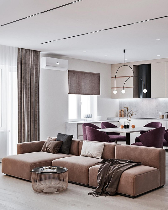 Фиолетовый — довольно тяжелый для восприятия оттенок, поэтому его нечасто используют в оформлении. Но в нейтральный бежевый интерьер можно включать разные оттенки, в том числе и этот сложный цвет. Бежевый отлично приглушает чрезмерную яркость фиолетового, вместе они выглядят гармонично и не пестро.